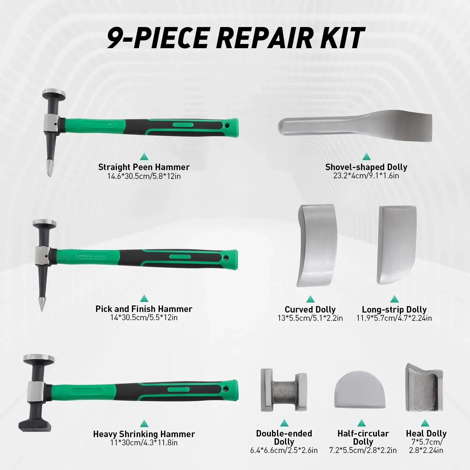 - This 9pcs Auto Body Hammer Crowbar Repair tool Set Comes In A Storage Box for Easy Storage and Transportation, Each Set Is Equipped With Standard Impact Hammers, Finishing Hammers, Reverse Bending Hammers, Bending Carts, Practical Carts, Double Head Manual Carts, and Contraction Carts, Which Can Perfectly Repair Dents On Large and Small Car Bodies