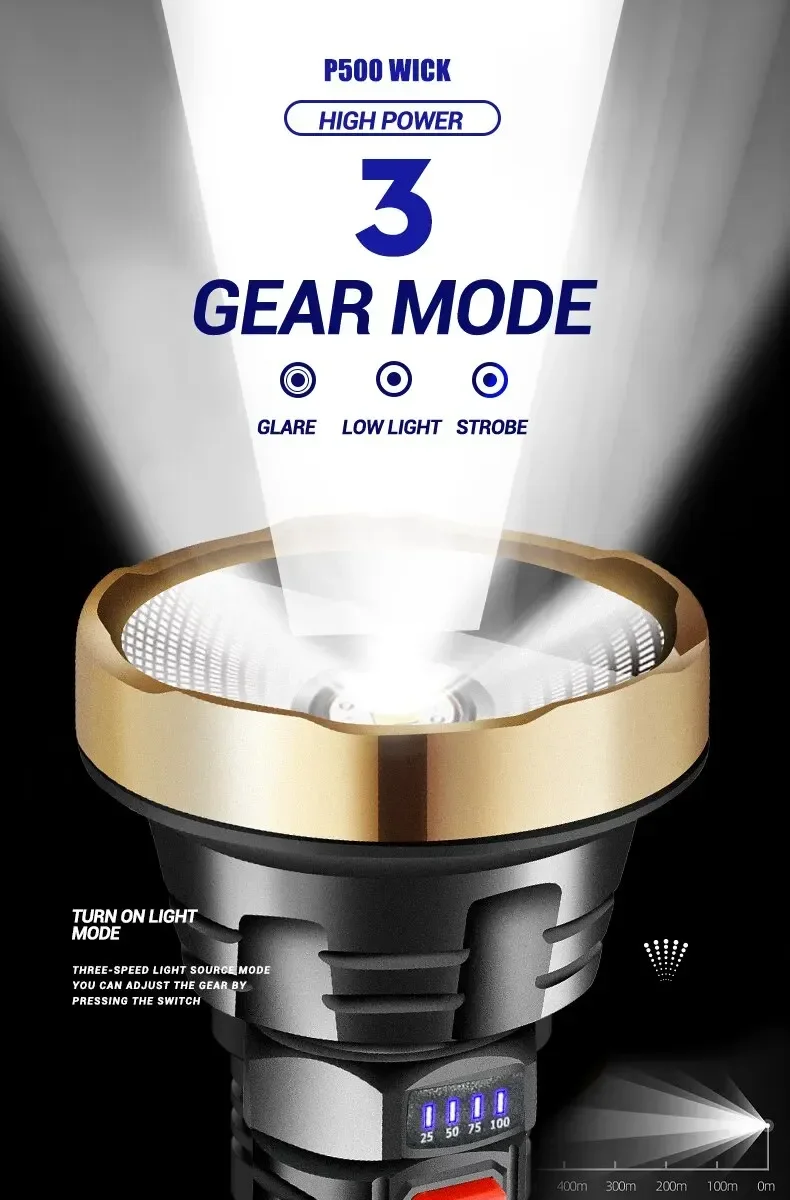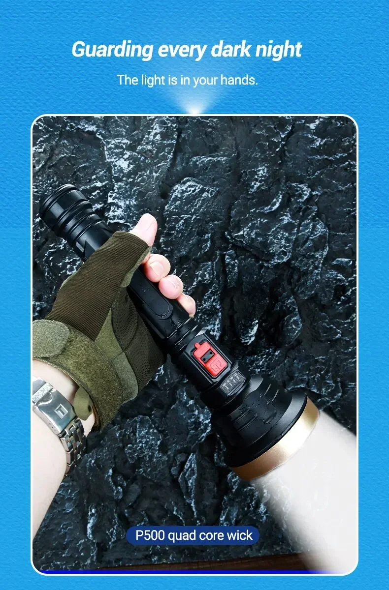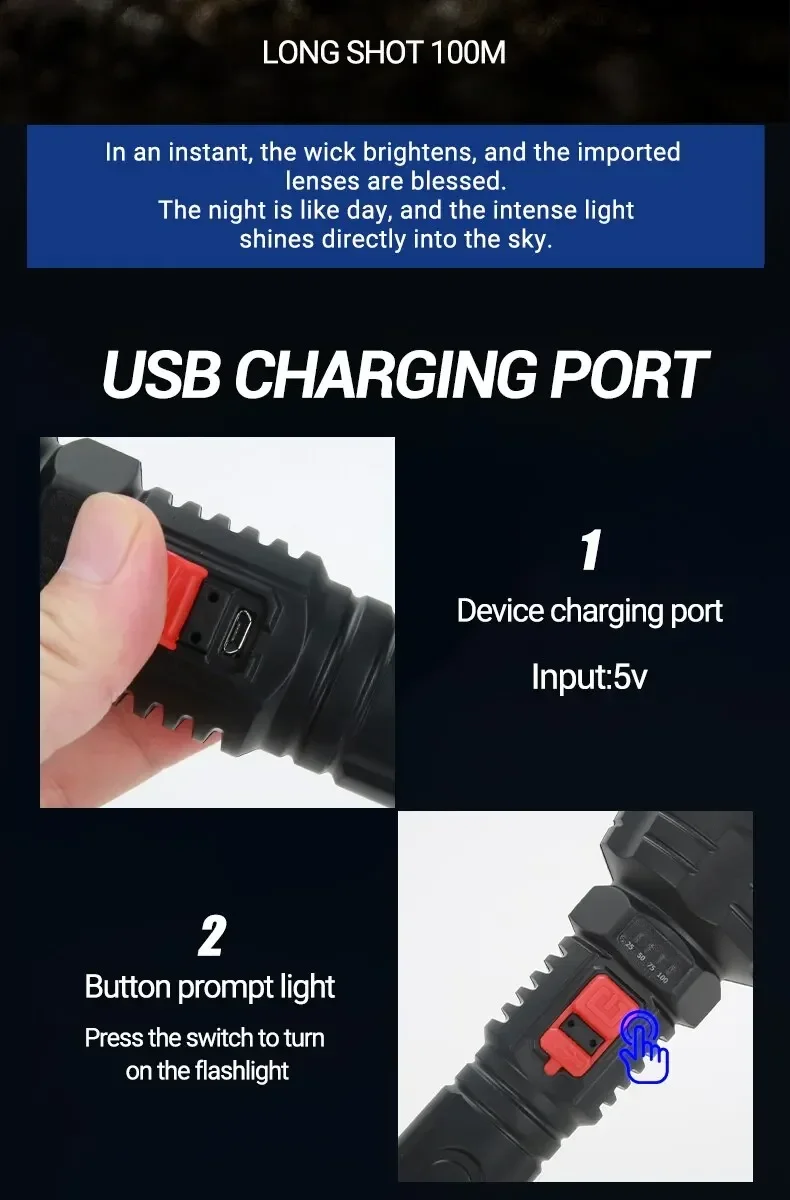 • High Lighting Distance :This LED flashlight offers a impressive lighting distance of 200-500 m, making it ideal for hunting, camping, and other outdoor activities.