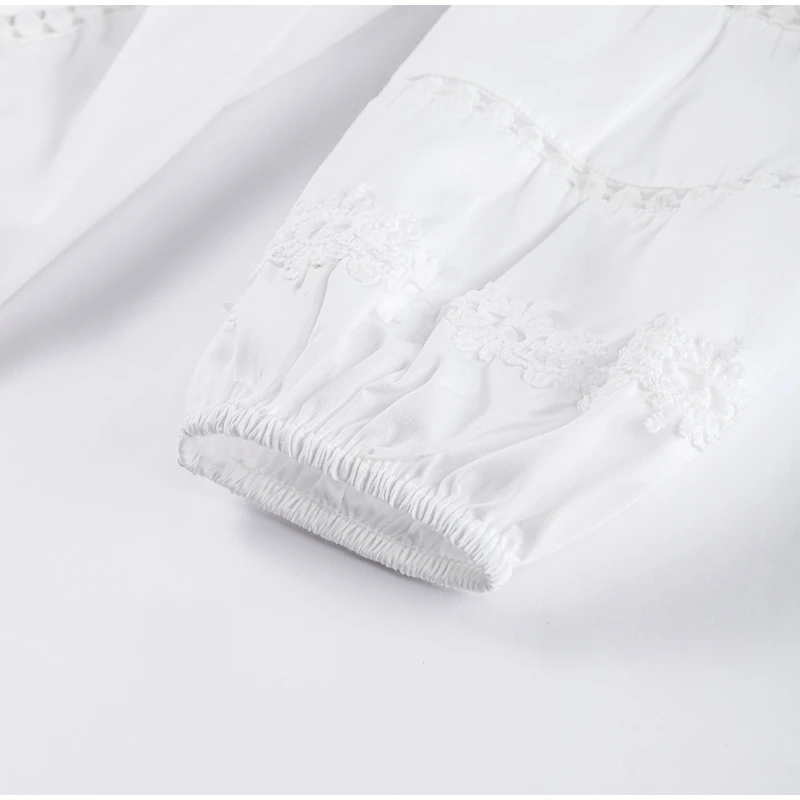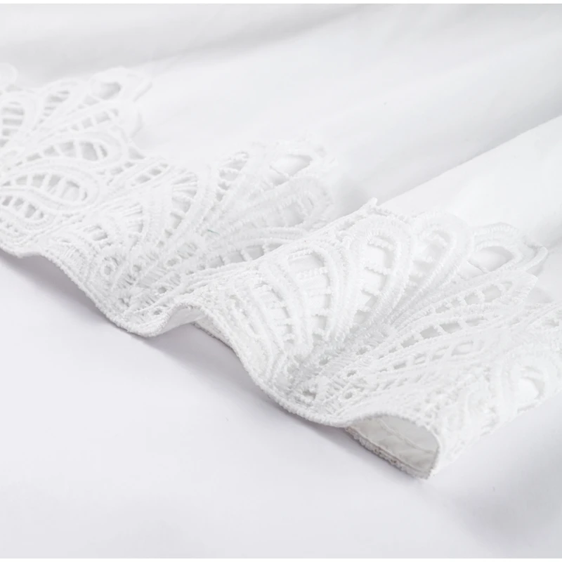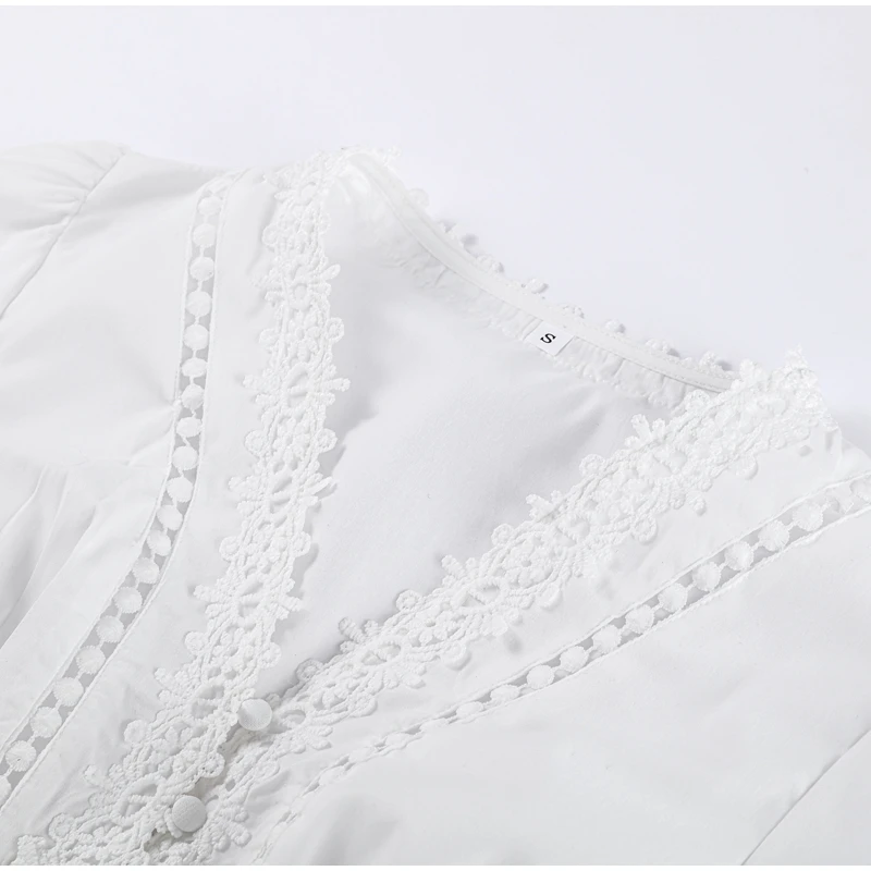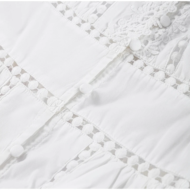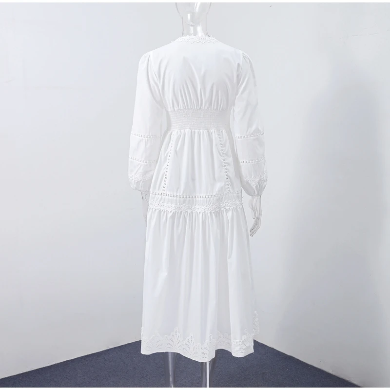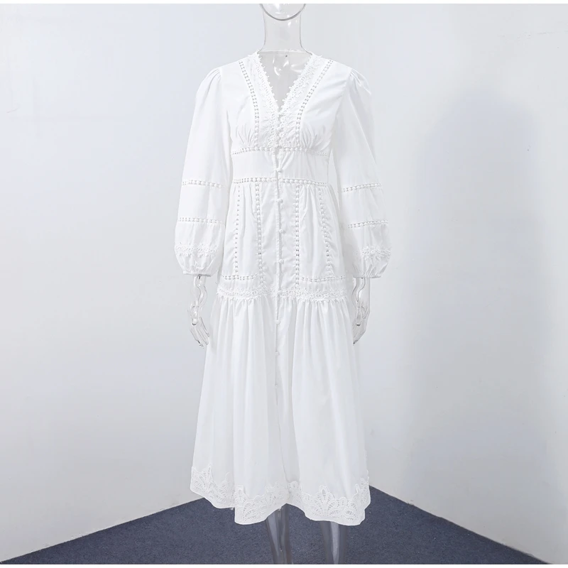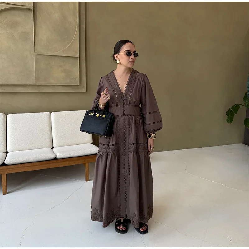 Elegant Lace Patchwork Hollow Out Dress Women Solid V-neck Long Lantern Sleeve Loose Dresses 2025 Spring Vacation Lady Robes