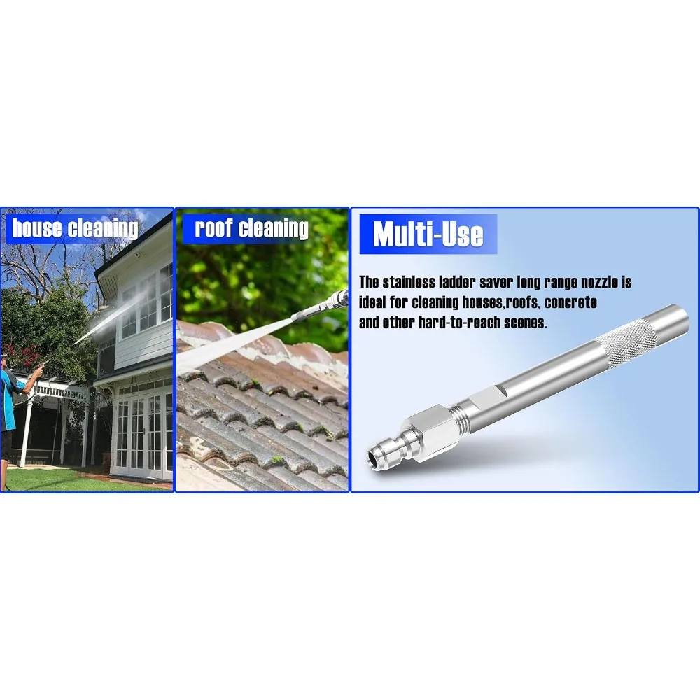 1 ADVANTAGE 2 HIGH QUALITY How to connect Pressure Washer Long Range Chemical Nozzle The connection is 1/4 plug, making it easy to quickly connect or disconnect from your pressure washer accessories.Long range pressure nozzle is compatible with most pressure washers and has a wide range of uses.It is the best choice for your commercial and home cleaning jobs.