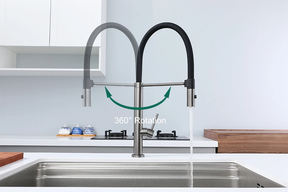 The pipe body can rotate freely 360 degrees, combined withthe pull-out function, to meet the needs of water intakein multiple directions, freeing up sink space.